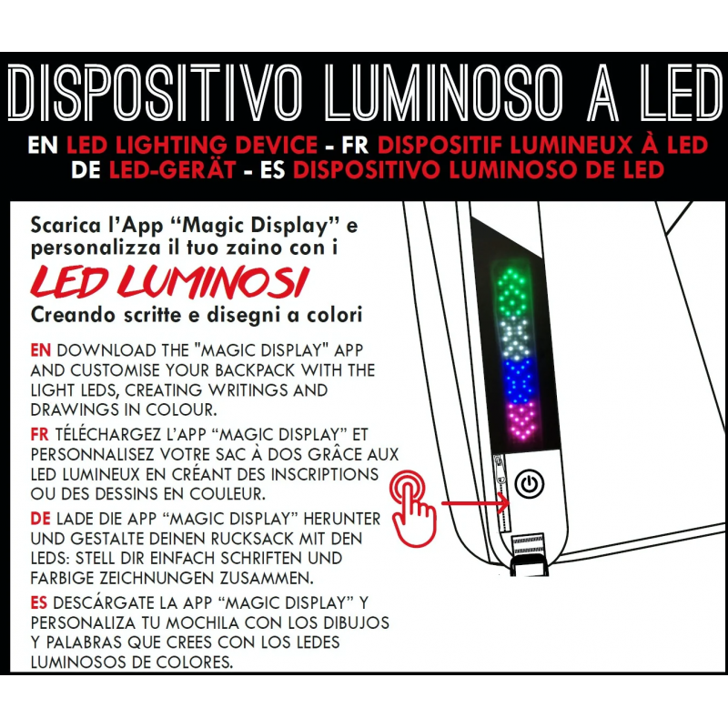 Questo zaino reversibile The Double, in questa Special Edition, è davvero sorprendente perché dotato di dispositivo led sullo spallaccio, che ti permette, tramite l’app Magic Display, di scrivere e comunicare le tue emozioni. Inoltre strizza l’occhio all’ambiente essendo realizzato in Eco Material, tessuto ecologico resistente e di grande qualità, ottenuto dal riutilizzo di 30 bottiglie in PET da 500ml. Completamente reversibile, in 3 semplici mosse stacchi lo schienale, lo rigiri e hai un altro zaino! Ha grande spazio interno e su ogni lato ha una comodissima tasca, oltre a quella frontale, per mettere tutto quello che ti serve per la scuola o il tempo libero. Con lo schienale imbottito e rivestito in tessuto e gli spallacci imbottiti e rivestiti in tessuto e rete traspirante, poi, indossarlo è sicuro e confortevole. Cosa aspetti a prenderlo? Questo zaino ti lascerà a bocca aperta, ma mai senza parole!