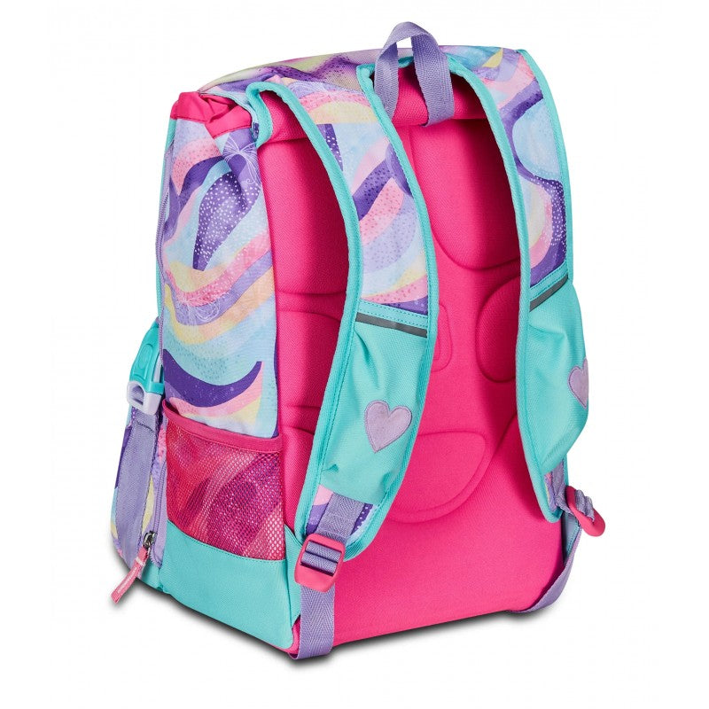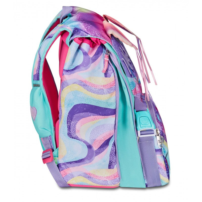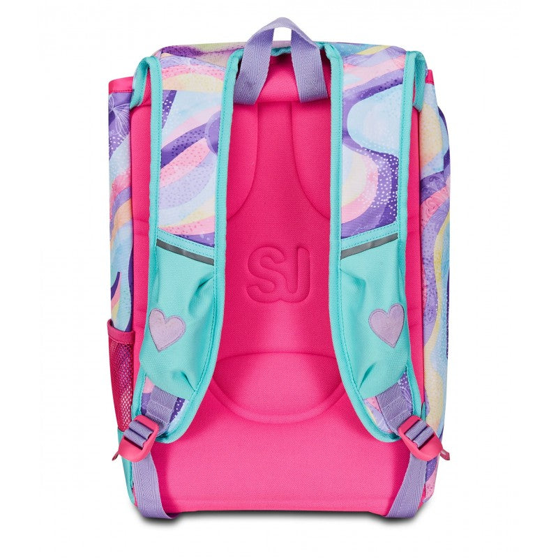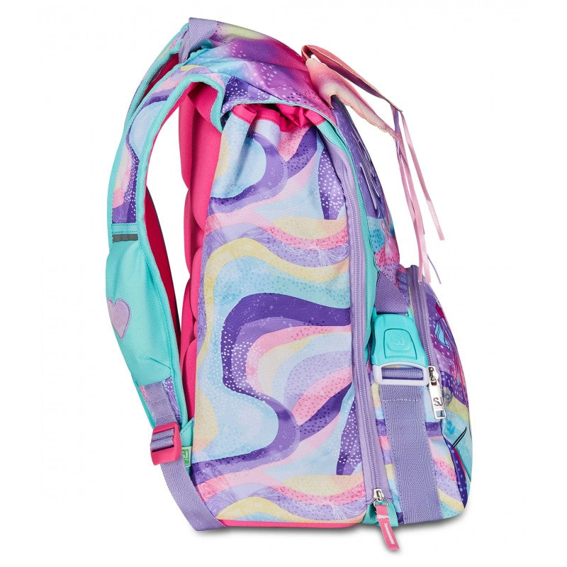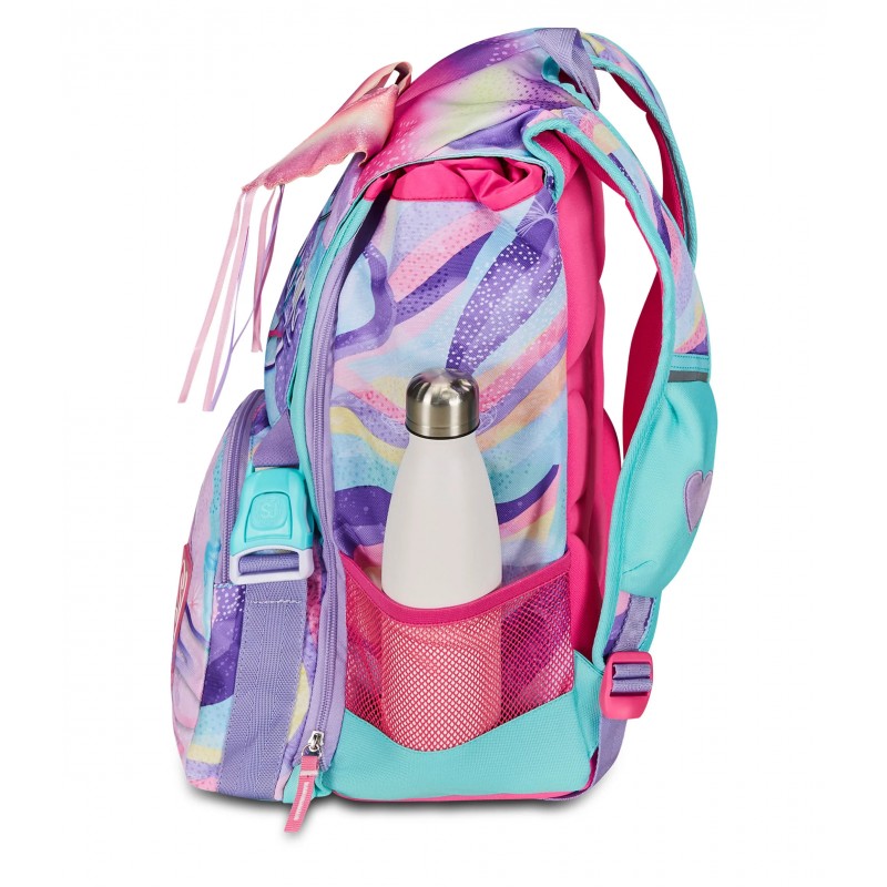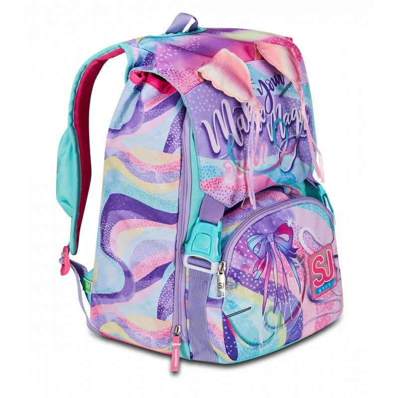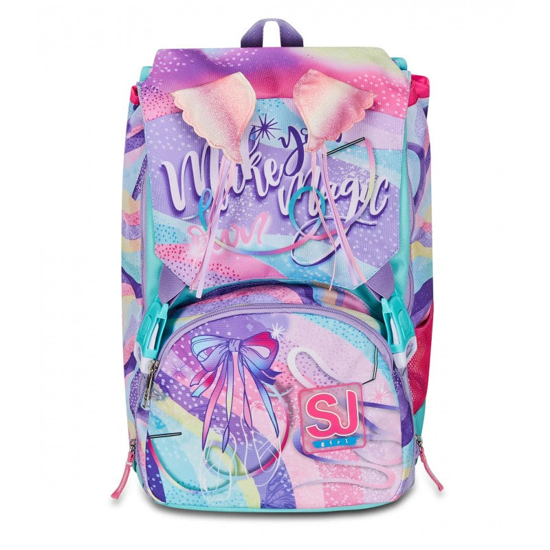 Ciao! Sono RHYTMICSOUL, lo zaino estensibile SJ GANG con cui vai a scuola, e con cui puoi giocare facendo sollevare le mie ALI SCINTILLANTI! Ho un doppio scomparto spazioso, di cui puoi aumentare facilmente la capienza tramite le zip laterali per poter accogliere e distribuire in modo ottimale libri, quaderni e tutto ciò che ti serve per la tua giornata, potendo sfruttare anche la tasca frontale. Inoltre, sono davvero comodo da indossare sulle spalle, grazie a schienale e spallacci confortevoli. In più, il fondo integrato mantiene la mia struttura inalterata, garantendo la stabilità del contenuto anche a pieno carico.